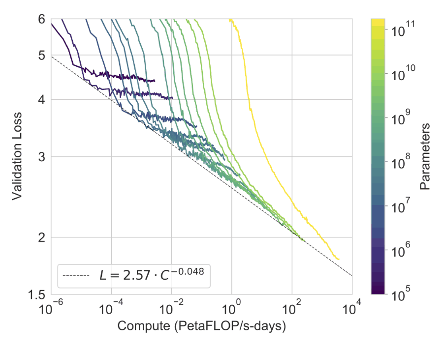 The scaling law [ref] predicts a ~20% reduction in loss for every order-of-magnitude increase in compute (i.e. increase in compute here means a combination of model size, amount of training data, training time/compute). It’s important to remember, the scaling law doesn’t guarantee uniform improvements across all downstream tasks.