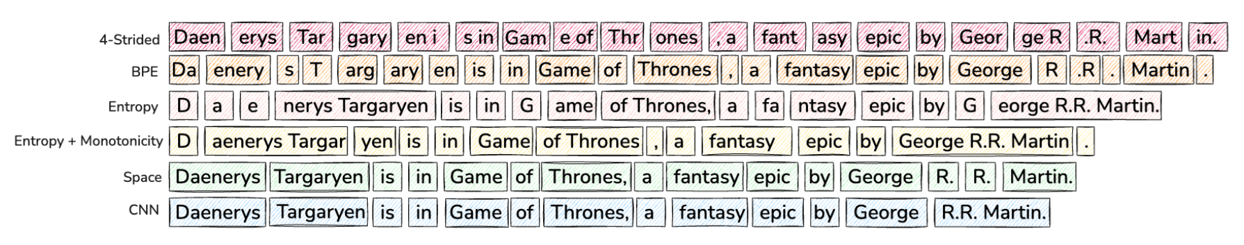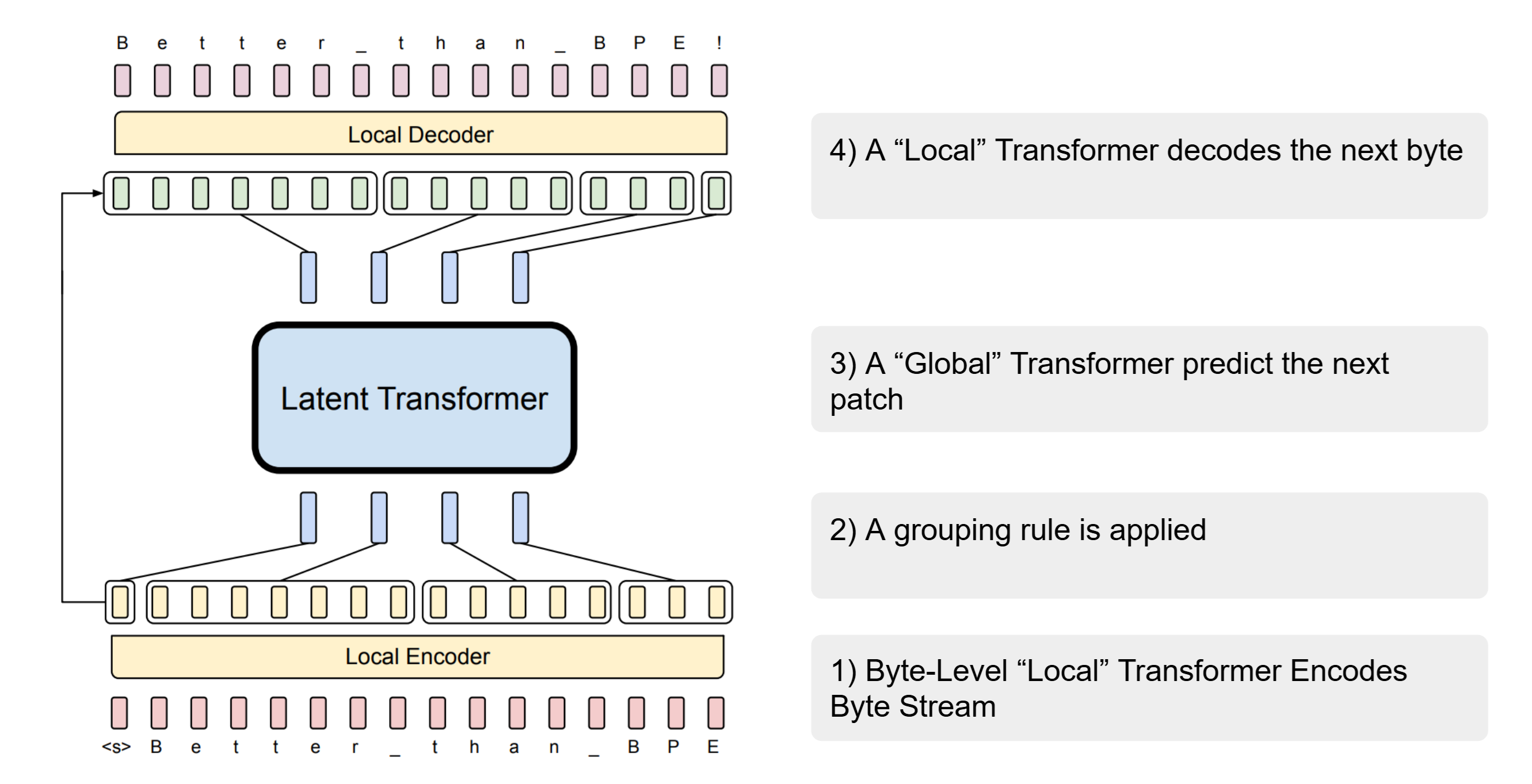 Space based segmentation is a great first step, but not all the words represent concepts or require the same amount of computation. Byte Latent Transformer / BLT uses entropy-based grouping to dynamically segment bytes into patches. Patches are created based on the entropy of the next byte, allocating more compute and model capacity to complex regions.